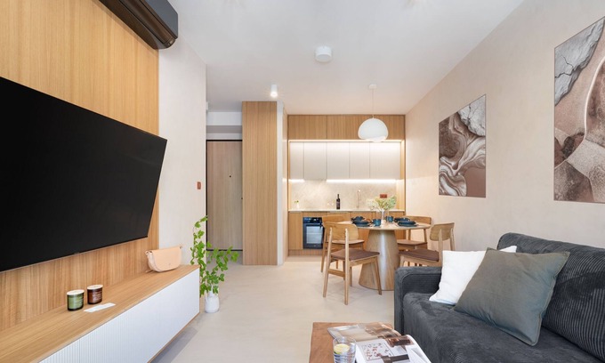 A modern, fully equipped apartment for up to 4 guests with a spacious balcony featuring seating for four.