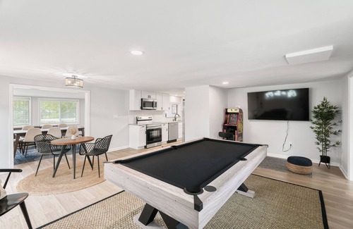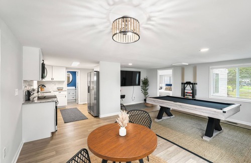 Back at the house, you'll find a spacious yard with a firepit surrounded by Adirondack chairs — the perfect spot to gather and roast marshmallows under the stars. Challenge your crew to a game of ping pong, cornhole, or giant Jenga, or enjoy a meal on the outdoor dining table that cleverly converts into a shuffleboard and mini bowling setup.