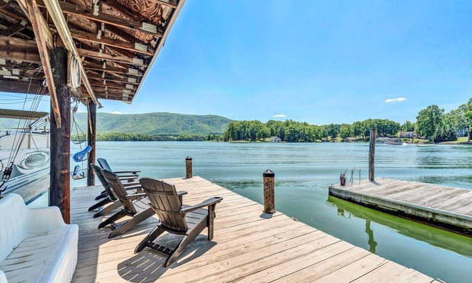 Thomwells Family Affair is the perfect lake house! You will not find another home at Smith Mountain Lake with everything the lake has to offer while sleeping 18 guests! Awesome amenities include two stand up paddle-boards and a tandem kayak, a walk in entrance to the large beach area, a fire-pit overlooking the lake, large dock with wide water views. The interior has just as much to offer with a spacious layout including three levels, so your family/friends have plenty of space to spread out but this home has wonderful gathering areas, as well!. The main level offers an kitchen breakfast bar with seating, a kitchen table that overlooks the lake plus a huge dining room table. There are two separate living room areas on the main floor with a large wall mounted flat screen TV in the largest of the two. The living room offers access to the huge deck with 2 dining tables that are perfect for outdoor meals with a gas grill or you may choose to hang out on the sectional couch. On the main level, there are 6 bedrooms with 1 king bed, 4 queens and one bunk bed with 3 full bathrooms on main level. The upper level offers a master bedroom with king, plus a trundle day bed (2 Twins) along with a full bathroom and sitting area. The lower level offers a family room with a large flat screen TV, foosball table, full bathroom and bedroom with a king. Walk right out of your family room onto the lower level patio and walkway to the dock, beach or the kayaks & paddleboards. With plenty of parking, a flat walk to the water and the most spectacular views you've ever seen, you and your family will want to return year after year to this wonderful home because it truly has everything that you need for the perfect family vacation!!