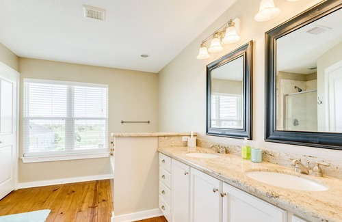 On the upper level, you’ll find the huge primary suite. This relaxing getaway boasts a private covered deck and a large en suite bathroom with double vanities, a walk-in shower and soaking tub. There's also a cozy nook with a twin daybed that’s great for kids.
