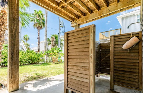 Located only 12 miles from the heart of Historic Downtown Galveston, this private rental beach house rental is sure to please everyone in your group. The wide driveway easily accommodates up to 4 vehicles to make unloading your suitcases & beach gear easy. The large ground level patio features an outdoor shower, picnic table, fish cleaning station, and charcoal grill – perfect after a day of fun on the beach.