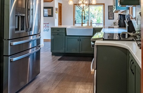 At the heart of the home lies a large, newly remodeled kitchen, seamlessly connected to the dining room, making it perfect for entertaining. Prepare anything from snacks to full meals in this well-equipped kitchen, complete with modern appliances and a large island with pendant lights hanging over. Appliances include a GE refrigerator (equipped with a drink drawer, chilling drawer, ice maker, water dispenser, and pull-out freezer), microwave, Bosch dishwasher, farmhouse deep sink, coffee maker, toaster, blender, and a double oven and air fryer combo unit (electric range with exhaust fan).