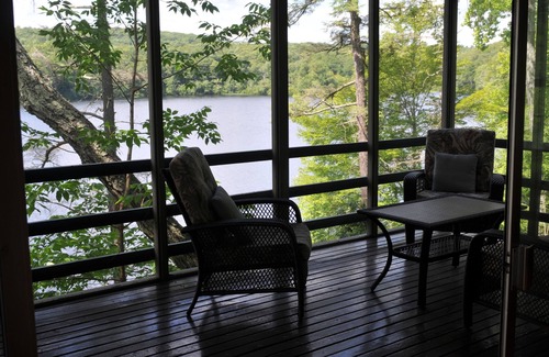Tucked into the hillside above the serene waters of crystal-clear Uncas Lake, this comfortable cottage is surrounded by its own wooded grounds with private lake frontage. Guests can enjoy the canoe provided, fishing, swimming, wildlife and tranquility (no motor boats are allowed on the lake). You may spot otters, beavers and ospreys diving for fish in the calm waters, deer in the woods and wild turkey from the balcony or one of the two decks. Inside the spacious cottage are cedar-paneled walls, cathedral ceilings and a office/library with books and games. Enjoy beautiful lake views from almost every room and the large screened porch. The main floor has a full kitchen, study with full bath, master bedroom with queen bed and full bath, great room with fireplace, huge screened porch, and outside decks, all overlooking the lake. Upstairs is a balcony overlooking the great room, 2 bedrooms and a 1/2 bath,. Downstairs, game room, 2 dressing rooms, 1/2 bath, washer and dryer. Yard, Dock, Raft, Boats.