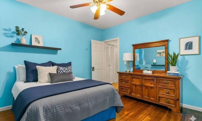 Welcome to your home away from home, a serene blue room nestled in a vibrant Connecticut neighborhood. This private haven is furnished with a comfy full-size bed for a restful night. Organize your belongings in the spacious full closet, and freshen up in the shared bathroom equipped with all essentials, from body soap to shampoo.
