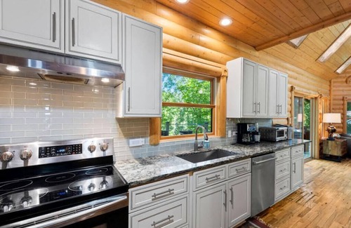 Spanning nearly 3,000 square feet across three levels, the four-bedroom, 3.5-bath cabin is designed for relaxation. Cozy up by the fireplace, take in the breathtaking views from the 850-square-foot deck, or soak in the outdoor hot tub, available year-round. Whether you're sipping coffee on the deck or stargazing by the fire pit, this home provides a peaceful escape from everyday life.