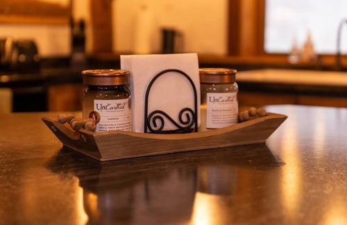 The common area boasts two couches and three chairs where you can relax and socialize with your companions. For your entertainment, a 75" Smart Roku TV has been provided. This part of the house is the original 1830s cabin, which adds to the ambiance with its exposed logs and timbers.