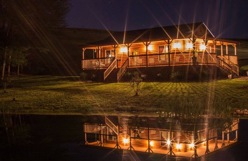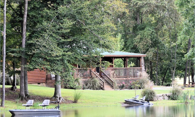 We would like to invite you to come and stay in our two-bedroom beautifully appointed cabin also known as the "Gazebo Cabin." This cabin features a full kitchen, stocked with everything you need but food to make your stay enjoyable. There is ample parking, satellite television, a large yard, and a wrap-around porch. Enjoy yourself relaxing while drinking your morning cup of coffee watching the morning sun come up over the tree tops as you sit on the very peaceful gazebo. Outdoors, you'll find everything you need for a relaxing stay, including picnic tables, fire rings, gas grill, charcoal grill and a gorgeous private lake stocked for catch-and-release fishing. (Fish from shore or use our boat at no extra charge!) This cabin is within feet of the waters edge. As evening begins fall a nice stroll around the property and along the creek just enjoying and soaking up nature there is no better way to relax. This cabin is everything you want to get away from it all!