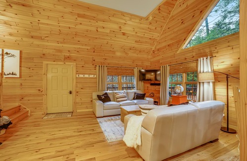Secluded and tranquil, this stunning hideaway, perfectly nestled in a hamlet, gives you a bit of quiet while still having easy access to the main road and near many local attractions. Upon entering this home away from home, you and your guests will immediately be greeted by the light wood accents, and high ceilings of a rustic cabin feel that everyone will appreciate. Sip a cup of coffee on the wraparound deck or a glass of wine while breathing in the fresh air. Little ones will love the game room, complete with a Ping-Pong table, foosball, and a dartboard as the adults watch a movie on the flatscreen smart TV. Don't worry about needing to check in on emails or schoolwork, as the high-speed Wi-Fi is more than ready to assist in streaming or Zoom calls.