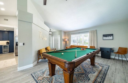 This stylish one-story retreat features a modern coastal design and everything you need for an unforgettable stay. Lounge by the private screened-in pool, catch some sun on comfy loungers, or unleash your inner kid in the vibrant game room with arcade games and a pool table.