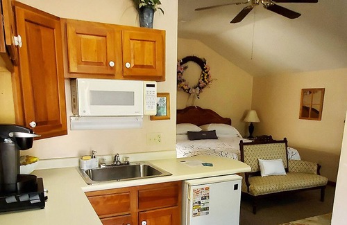 Our Kennedy Cottage includes a king size bed, private bath, and gas fireplace . It has a kitchenette with coffee maker, microwave, and fridge and direct access to the hot tub and pool. Bath Robes, Beekman Bath Amenities, new bedding, Magnavox Roku TV, and upgraded WIFI included. Guest lounge on the second floor where you will have access to a daily continental breakfast, coffee 24/7, Board Games, and glassware.