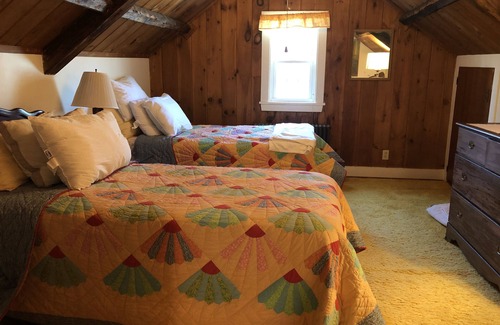 First floor queen bedroom & bath, upstairs twin bedroom and office or playroom with chairs, couch, desk. dormer ceilings and exposed beams. Full kitchen with all appliances, dishes and utensils, washer/dryer. Outdoor shower, large pond and mowed yard for games.