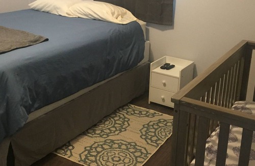 You get the entire house (upstairs & downstairs) with the rental, which is a total of 4 bedrooms, 2 separate kitchens and 2 full bathrooms. The upstairs has 2 bedrooms: 1 king bed, 1 queen bed and a crib. The downstairs has 2 bedrooms: 1 queen bed and a bunk bed with a full-size bed on bottom and twin on top.