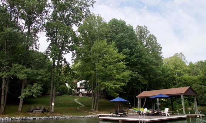 Journeys End brings you into your own private cove side paradise. Privacy surrounds you on every side of this magnificent Tudor waterfront property. Our home offers the perfect place for the luxury lake experience. You won't be looking at other homes but instead over two acres of pristine woods and an expansive 300 foot waterfront area with a huge gentle sloping lawn and gorgeous views of the lake from both the deck and dock area. You will feel like you have your own private park. The swimming area is ideal because it is protected from boat traffic and you can float to your hearts desire without floating away. To insure your safety we have added a dock lifeguard shock warning system to our swim area. Our water front has a great floating dock, stationary dock and a sandy beach area. When you are ready to put your feet up you can sit in the huge hot tub, or choose one of 3 decks or the lakeside dock area. Enjoy exploring the lake as you cruise the shoreline in our four complimentary kayaks or two paddle boards. At night enjoy our complimentary firewood and the lakeside fire pit area to roast your marshmallows. Every detail has been taken care of, and the quality of the home, appliances, and furnishings are unmatched. The expansive kitchen is fully equipped and your family can enjoy meals together around the large oak table with seating for ten. Granite countertops and high end large and small appliances are available for you to use. Watch movies together in the expansive great room with cathedral ceilings which can seat ten plus people. Children will enjoy the game room which can be found downstairs next to the children's bedroom. They can enjoy Playstation 3, bring their own gaming system or watch DVD's. Battle it out as you enjoy playing a family tournament on the air hockey or foosball table. You will find high speed internet and Wi-Fi throughout the home. This home offers over 3,500 sq. feet of living space with 5 large bedrooms including a huge master suite and attached bedroom. There are 3 bathrooms, one on every floor and a half bath off the deck. Located right off the main channel of Craddock's Creek you are in a protected cove, but only a cove away from the most beautiful part of Smith Mountain Lake. We have a whole house generator to insure you are uninterrupted during your stay. The location is ideal and only a short drive to all the restaurants, boutiques, and grocery stores. There is plenty of parking for as many vehicles as you wish and plenty of room for your boat trailer. So be the first to let your journeys end be here in our cove side paradise.