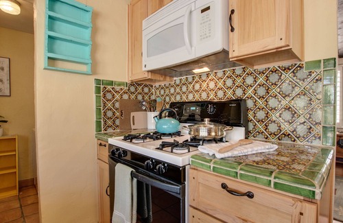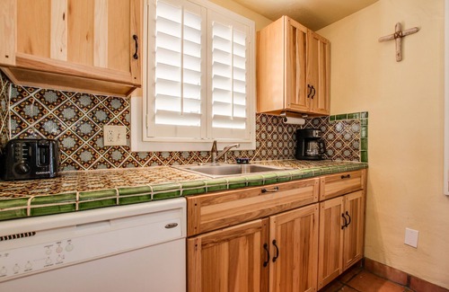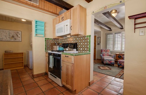 La Cholla Vista was originally part of the historic Black Arrow Lodge and sits at the base of Sombrero Peak and right near the border of Saguaro National Park and Sanctuary Cove. Breathtaking Mountain View’s and hiking trails are right out your door. 2 bedrooms and 2 bathroom, fully stocked kitchen for meals, patio that faces the mountains, fireplace to enjoy the majestic sunsets and beautiful Mountain View’s. 2 miles from grocery stores, Starbucks, shopping, and the Stardance Event Center!