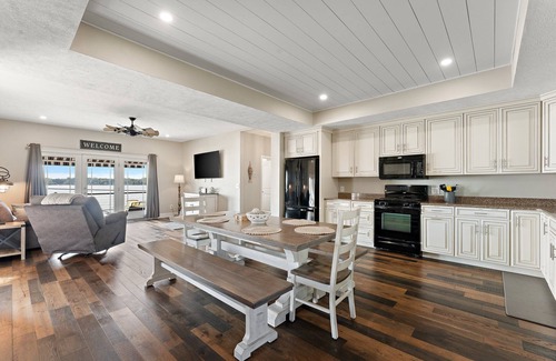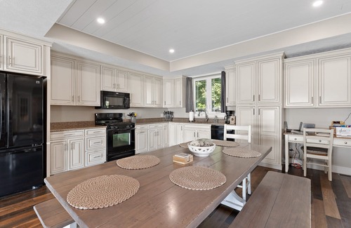 The kitchen is fully stocked with a large farm style table to bring the family together. If you need more room we also have a banquet size table and chairs stored in the laundry room.