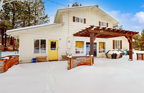 All-season adventure can be achieved at this quiet Bend home! Surrounded by trees and boasting a great outdoor space for furry members, The Yellow Door Cottage ensures a comfortable and relaxing stay. The interior of the home boasts a great mix of modern comfort and artistic quirk! The open living area is cooled by central air during the summer and warmed by a wood stove during the winter. Cozy up on the oversized sofa and stream your favorite shows, or gain some inspiration while writing at the window-side desk.