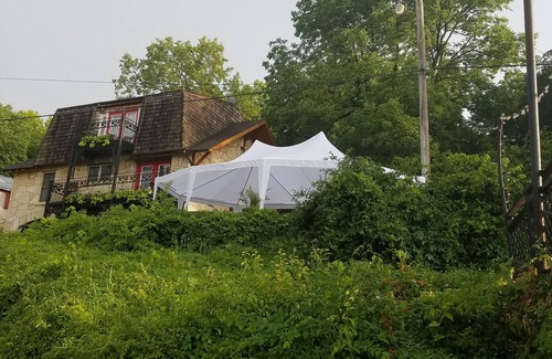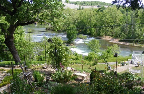 Rustic stone Manoir, with a private entrance and grounds, was built in 1930 with private outdoor patio fireplace and seating area perfect for gatherings under the stars. Make s'mores or enjoy grilling with family and friends. Villa has two bedrooms with a full kitchen completely furnished. The living room has a romantic fireplace, large flat screen T.V. with Dish and DVD/VHS. Step into luxury in the master suite with a marble counter top and walk in shower. Beautiful arched stone architecture on the lower patio is situated underneath the spacious balcony above that is ideal for outdoors meals and while enjoying the scenic beauty from the river below.