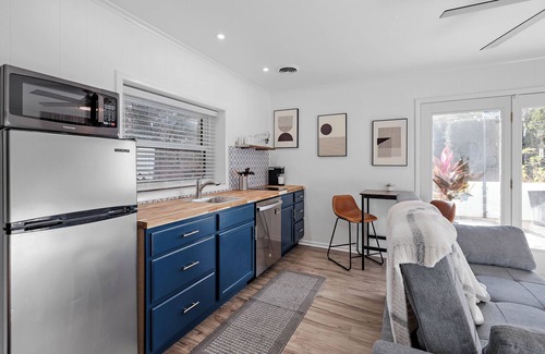Cozy up with a movie in front of the custom wood slat wall, cook dinner with a well-stocked kitchenette, and get a quiet night's rest under a stylish wood ceiling.