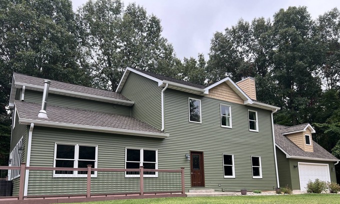 Welcome to our private oasis! Enjoy your family time or get together at our secluded property. Wildlife sightings are plentiful. Huge pool, spacious decks, hot tub, and plenty of indoor space. Sleep 10+ comfortably and 2 kitchens for ultimate flexibility! Need to workout? No problem! Commercial gym equipment in the basement! Stay connected with Starlink internet access. Smart tv. Large pole barn available as well if needed!