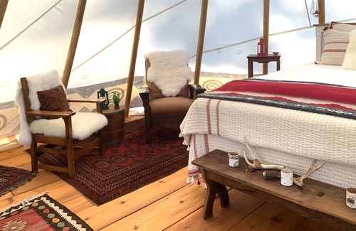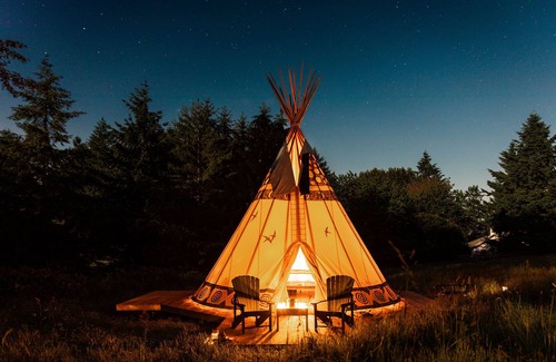 Just over an hour from Portland, Oregon, This 'adults only' Tipi allows guests to enjoy an authentic Glamping experience. It sits atop a custom Cedar deck, so guests can enjoy a real floor. The Tipi is very spacious with plenty of room for 2 comfortable lounge chairs and a queen size bed with a 100% Latex mattress.