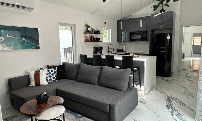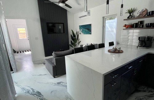 Have fun with the whole family at this brand new, modern private free standing guest house. Full bedroom with king size bed, with a finished loft including a queen bed. There’s also a queen pull out sofa in the living area. Enjoy your privately fenced backyard with a hot tub and putting green.