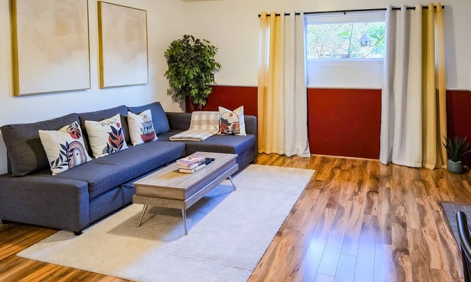 The suite features a comfortable bedroom with a queen bed and a convertible sofa bed in the living room. Stay connected with high-speed fiber internet throughout. The private bathroom is stocked with extra towels and essential amenities, and you’ll have access to a shared in-unit washer and dryer for added convenience.