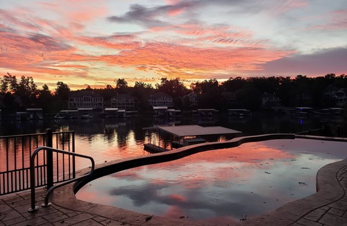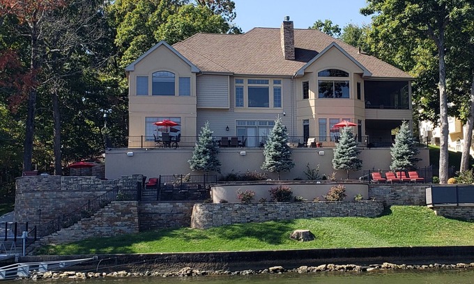 Beautiful home sitting in cove with main channel views. Private heated pool and outdoor kitchen new 2021. Pool will stay heated late March through mid October. Outdoor kitchen equipped with wood burning pizza oven, EVO grill, 2 mini refrigerators lots of granite countertop and lakeside firepit. 2022 updating hardwood flooring, formal living room and dining room. 7 bedrooms (4 with lake views) 6 full baths and one half bath. Home sits on 130 feet of lakefront with lakeside patio over 1100 square feet. Patio furniture new 2020 and 2021. Dock is available to use with one boat slip measuring 14x40 and 2 jet ski lifts. Swim platform measures 10x30. Plenty of room for relaxing on the swim platform. Large kitchen and dining room with access to the outdoor screened in 3 season room (built in gas grill). Kitchen is well equipped to serve up large family meals with double oven. Plenty of countertop space and cabinet space. Lower level of house has a large game room with pool table, arcade game, and card/game playing table. This room has fireplace and bar with barstool seating. Great gathering spot for evening fun. Room has patio doors out to large expansive deck with views of cove, private pool and main channel. Hot tub is located in covered porch to enjoy regardless of weather conditions. All bedrooms are equipped with televisions. Great parking and access to garage. Golfing, eating, groceries and restaurants nearby. New patio furniture 3 high top dining tables with seating for 12 and 6 person patio table with fire feature.