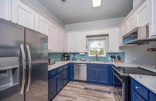 The entire 3 bedroom 3.5 bath house has recently been remodeled top to bottom with coastal finishes and high-end furnishings. Stainless appliances in the kitchen, which is fully stocked to cook and serve your guests.