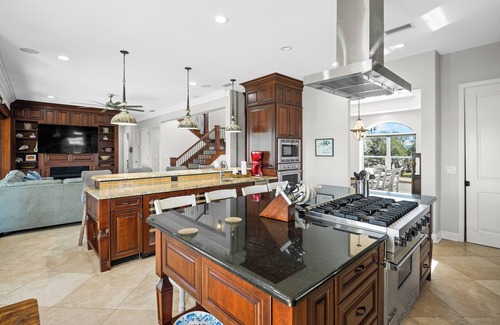 The living room and game room both feature ample seating with 75" 4k HD TVs. There is also a 65" 4k TV outside in the Sunken Bar by the Pool! All the bedrooms feature 4k TVs. All TVs have voice command remotes with YouTube TV service provided. Streaming Services all available. There is super fast wifi internet throughout the house.