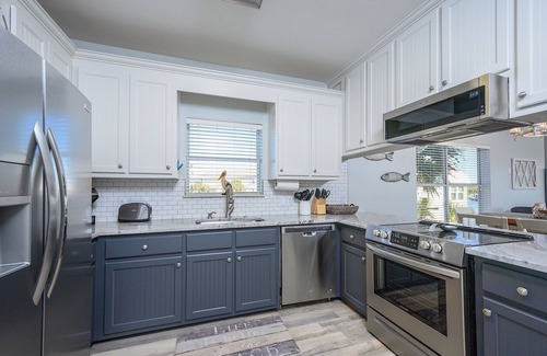 The entire 3 bedroom 3.5 bath house has recently been remodeled top to bottom with coastal finishes and high-end furnishings. Stainless appliances in the kitchen, which is fully stocked to cook and serve your guests.