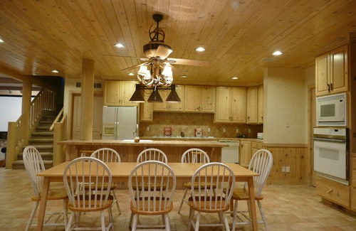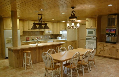 Sleeps 25 + All bedrooms are oversized with extra large closets. Open Floor Plan and more!!!. Large Living rec room, with huge theater, billiards table and several sofa/futon sleepers and bean bags for kids. Game room with toys and games for all ages. Soda Fountain with loads of sodas, keuring with k-pods next to the dining table that seats 10, with 2nd & 3rd tables each 6-8 more, several bar stools, more tables and chairs available for larger gatherings. enough for 30+