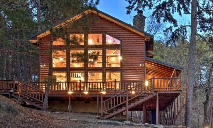 Getaway to the treehouse escape that is 'Dancing Bear Lodge!' With floor-to-ceiling windows, natural views, a two-story rock fireplace, soaring ceilings, and a wraparound porch, this 2-bedroom, 2-bath vacation rental home offers both warmth and peacefulness. As you lounge inside up in the reading loft or outside in a rocking chair and listen to the birds, you'll be surrounded by tall hardwoods and swaying pines. Spend your days hiking at Beaver's Bend State Park or fly fishing at Mountain Fork River!
