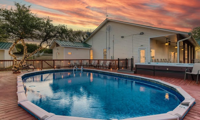 Enjoy 5 private acres in the Hill Country at this luxurious 5-bedroom hilltop estate in Spicewood, TX. Relax in the pool and heated spa, host dinners in the outdoor pavilion, or challenge your group to games in the garage lounge. Close to Lake Travis, wineries, and Dripping Springs. Perfect for family retreats or group getaways!
