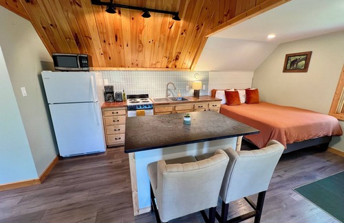 The rental itself is located above a garage (note that there are steps to the entrance) and is studio style with a full kitchen, queen sized bed, living area with large television and recliner sofa, plus a private bathroom with walk-in shower.