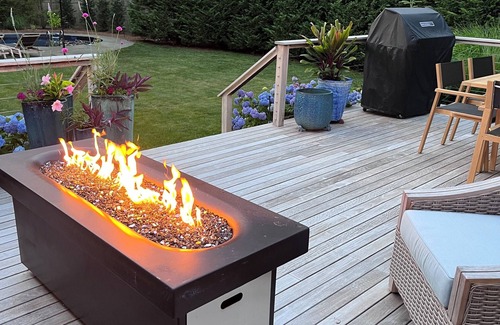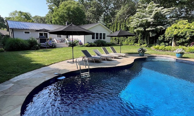 North Fork oasis tucked away on a private road. 3 bedroom 3 bath home with inground swimming pool, hot tub, full gym outdoor seating on the deck with fire table and barbecue. Last minute 4th of July week availability.