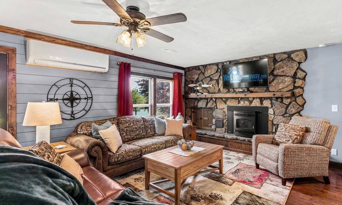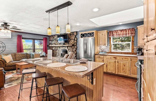 Hideaway Resort is located on the James River arm of Table Rock Lake between points 11 and 12. Although the resort is not located in Branson, you are just a 35 minute drive away from everything the area has to offer. The first thing you will love about this property is the large open living room, kitchen, and dining room area. This will set the stage for dinners, game nights, and memories that will last for years to come. The living room has plenty of seating for all. A favorite is the luxury electric dual leather recliner! You will want to nap here. The living room also has a new smart TV with satelite, so you don't have to miss your favorites while at the lake. The kitchen has updated appliances and truly everything you need to prepare your favorite meals and serve everyone in the lodge. In addition to the large dining room table that seats eight, the breakfast bar also seats six, and there is a gaming tablein the living area that seats four.