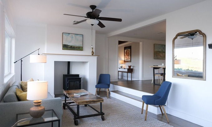 Minutes to downtown The Dalles and an hour and a half from Portland, relaxation awaits in this two bedroom home nestled among cherry orchards. Two generous living rooms and a front patio boast sweeping views of the Columbia River Gorge, Mount Adams and the surrounding farmlands. A pellet stove in the front living room creates a cozy atmosphere during winter nights, and a firepit outside invites toasty smores on spring evenings. Comfortably and eclectically furnished, two bedrooms feature new queen beds and fresh linens with an additional queen sized pull-out bed available upon request in the family room. The bathroom includes a tub for post-hike soaks, and a washer and dryer are located in the mudroom.