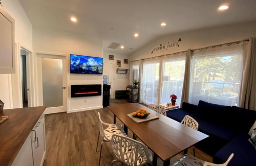 In the lovely living room/ dining space there is a pullout couch that turns into a full sized bed, a dining table that seats up to six that can be folded in for more space, and a 50 inch TV.