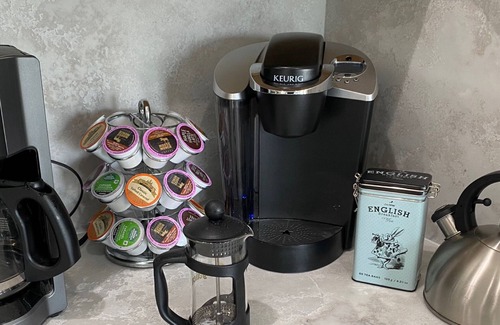 The kitchen features stunning quartz countertops and backsplash and has stainless steel appliances. It is fully equipped with all of the necessities to make your stay easy and enjoyable, including a double oven, dishwasher, a Keurig coffee maker, regular coffee pot and a French press, Crock-pot (both large & small), blender, toaster & air fryer oven, microwave, hand mixer, griddle top, waffle iron, electric juicer, a separate ice maker, and even bar equipment for the mixologist! We are also stocked with basic spices, oils, foil, plastic wrap, etc. The dining area comfortably seats 8 people with 4 additional seats around the kitchen island area.