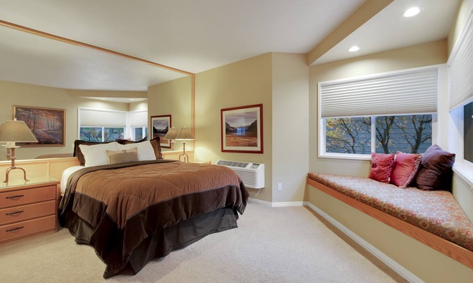 When you want to stay both near Bend and near nature, but don’t need a whole home, a Mt. Bachelor Village Resort hotel-style unit on River Ridge may be the perfect solution. Located along the top edge of a dramatic boulder-strewn canyon over the Deschutes River, this River Ridge condo located on the ground level gives you easy access to the Deschutes River Trail and stunning natural beauty. Each unit has a spacious queen bedroom with a TV, desk, coffee-making station, mini fridge, sitting area and separate full bath. Wide corner windows bring in lots of light, and a mirrored wall amplifies the effect of calm, luminous space. The bed’s quality mattress and linens are the luxurious center of a layout with remarkable versatility. Walk out your door and gaze down the canyon as the wind sifts through the trees, or join the 2-mile Deschutes River Trail from the resort. Hop in the car for a five- or ten-minute drive to dozens of terrific Bend restaurants and extensive shopping at the Old Mill District or Downtown Bend. Skiing at Mt. Bachelor is 20 minutes away, and Deschutes River watersports and golf are even closer. Of course, all the Mt. Bachelor Village Resort perks listed below are available to you, making this home away from home both economical and incredibly rich in amenities.