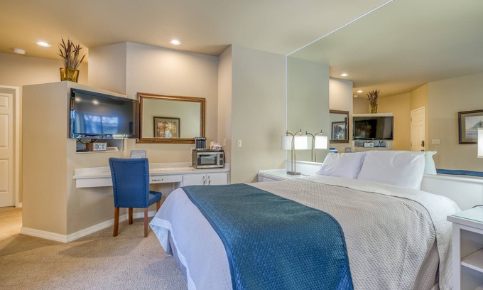 Bedroom 1: One Queen Bed, TV, Desk, Coffee, Sitting Area