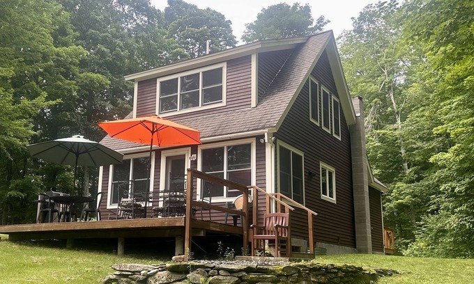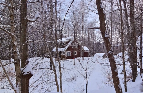 Paradise! A private Green Mountain Reserve. With many trails, swimming holes, unique and fantastic views. Hike or snowshoe right from the house! Minutes from all skiing, seconds from country store. New, cozy house with 3 bedrooms plus kids' cubby, 1 bathroom, fireplace, many windows, grill, sunny deck and shady yard. Wildlife abounds. Brooks and river with trout. Salad garden and flower beds. Outdoor fire circle (wood available). Four wheel drive required in winter for steep driveway. Hot tub will not be operational. Private!