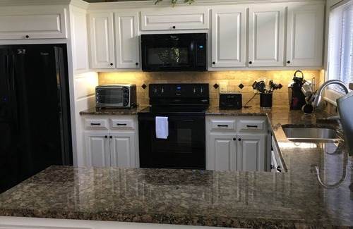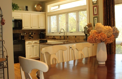 The house is set in small community where the majority of homeowners occupy the homes. Please be very mindful that this is not a resort and following the rules set by the HOA and the owner is tantamount! This one story ranch has 3 bedrooms, 3 and 1/2 baths and is perfect for family gatherings or girlfriends' weekend. The large foyer separates the house and has access to a half bath, an oversize garage, and a doorway to the partially covered deck. The deck wraps around the back side of the house to the Master Bedroom's private entrance. To the left of the foyer is a doorway that leads into a small sitting area and 2 bedrooms; each with their own bath. The first bedroom has twin beds and the 2nd a queen bed with its own private covered porch. To the right of the foyer is the formal dining room and bar. You can access the formal dining room from the foyer or the hallway which opens to the kitchen and great room area. The kitchen is large and comes fully equipped, including a table that seats 6, which flows into the living area. There is also an enclosed wet bar and a laundry closet with a full-size washer and dryer. The wall of windows allows for a beautiful view of the mountains and another door which opens to the deck. There are several chairs and lounges as well as a patio table and chairs. Cushions are stored in the outside closet off the covered deck. There is also a gas grill.