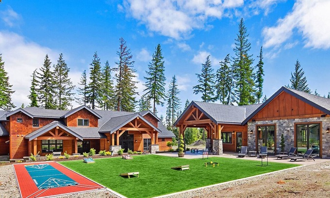 This newly constructed mountain home on 3 private acres is the Northwest’s most unique and complete vacation experience! No expense was sparred in the construction and furnishing of the beautifully appointed 5,100 sq. ft. main home, and the 2,500 sq. ft. pool house. The pool house boasts a 16ft by 33ft heated pool, 8-10 person hot tub, living area with a kitchenette, ping pong table, and a private bath. During the summer months slide open the according doors of the pool house and enjoy the sun deck and outdoor shuffleboard court.