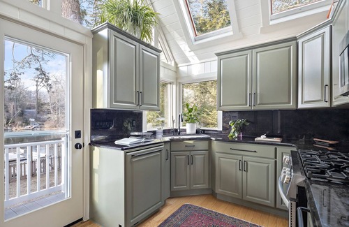 Arguably the most comfortable room in the house. The living room has a gas fireplace that keeps the room very warm in the winter months without the mess of a wood fire. In the summer, we open up the skylights/windows and there's a cooling breeze from the lake. The sectional couch is from West Elm and quite comfortable. We have a gallery wall with the Frame TV and mostly all of the streaming platforms which you are free to use. There's a dining table which seats 6 comfortably.