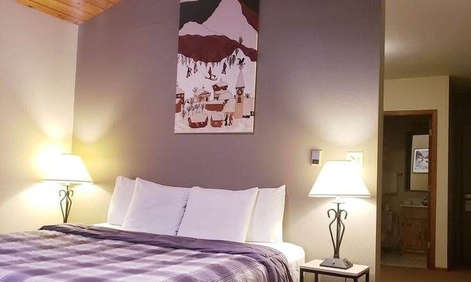 Snowed Inn is our snow/ski themed room offering a semi-open layout with beautiful knotty-pine cathedral ceiling, one KING bed, sofa and one small bathroom. Ideal for couples/romantic stays, and single travelers. Bathroom offers a shower stall. Equipped with a mini fridge, microwave, 4-cup coffee maker and one 37" Flatscreen TV.