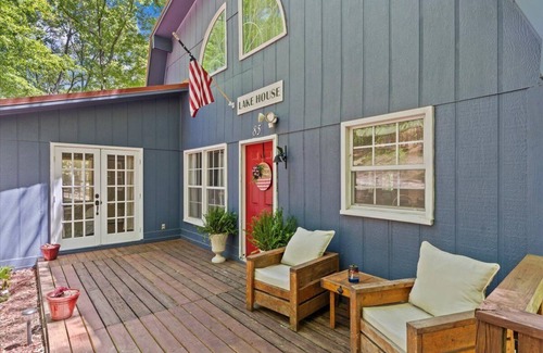 Welcome to the lake house! This unique and tranquil escape has everything you need for an enjoyable time away from home. Featuring two private bedrooms and 1.5 baths. There is a sleeper sofa in the living room with a memory foam mattress and a trundle bed in the flex room that pops up into a king. Primary loft bedroom features a King size bed and half bath. Downstairs bedroom features a queen and adjoins the main bathroom. The living room features a 75” tv, electric fireplace, and comfy seating. Dining room is spacious enough for a family meal. Kitchen is fully equipped to cook something delicious. Outside is a place to truly relax. Front deck allows for nature viewing and comfy sitting. The back deck has a grill, and dining area. Out back there’s a wonderful view of the lake. This property is waterfront with direct access to the water. Fishing is allowed but no swimming. Fishing gear is under the back porch for your use! Covered parking is available for up to 2 vehicles.