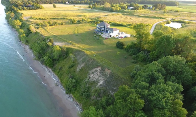 Enjoy 10 private acres on Lake Michigan in a unique, luxury home with spectacular views. The view is priceless! Fall asleep to the sound of the waves crashing. Immerse yourself in nature escape form the electronic devices and watch bald eagles fly at eye level less than 30 yards away as they hunt for "surf & turf". Enjoy the deer, the turkeys, hawks, eagles, pelicans, egrets, sandhill cranes, geese, ducks, foxes, and so much more on this remote, tranquil retreat. A bird lovers and wildlife lovers dream. Bring your camera!!! Enjoy the stars and the heavens without any city street lights to distract you. Watch ocean liners, sailboats, and fishing boats pass by while you relax on the decks or from any of the magnificent views from this unique property. The property is mostly hidden from the road with rolling dunes and berms that will remind you of the PGA Championship course Whistling Straits only 15 minutes away. Try a different kind of golf with the family. Disc golfing is available right on our retreat. Discs available along with actual baskets (weather permitting). Other great activities include the volleyball court, bean bag toss, and plenty of room to play catch run around, or get a football game going. Take advantage of the private walkways that cross deer and wildlife paths. Experience a sunrise as you have never experienced before! 8+ guests can enjoy this luxurious retreat with jacuzzi bathtub, fireplace, external fire pits, private beach, 10 acres of land, deluxe gas grill, 2 levels of expansive decks with an ocean-like view, wifi, NFL Sunday Ticket along with HBO, Showtime, Cinemax, Starz, Netflix and more. "Nana's FunZone" also allows for great family bonding and entertainment options. Play air hockey or convert to table tennis or and expansive dining table that is great for eating, playing cards, solving huge puzzles etc. Foosball and electronic dart boards are also waiting those that want to have some friendly competition. There is also a large smart TV to enjoy games or movies or bring your own gaming device and enjoy. The bar space offers the views of the expansive outdoor area with amazing views of Lake Michigan.