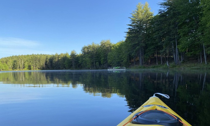 A waterfront, gorgeous log home with panoramic, stunning views of the pristine, 15-acre Huse Pond. A simple walk out the front door and you will find yourself perfectly placed to go fishing, boating, kayaking, canoeing, or swimming in the summer as well as ice-fishing or riding a snow mobile in the winter! The lake is home to the dam of a beaver family, plentiful freshwater bass (great for fishing!), breathtaking cranes, and other wildlife.