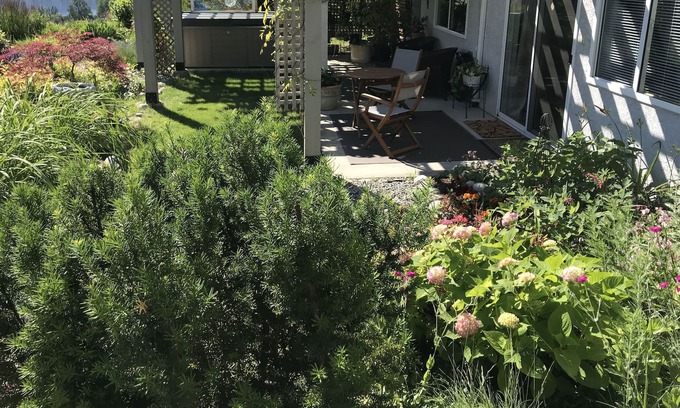 We are in a semi rural community called Kaleden. Our B&B has a fabulous lake and mountain view and a lovely garden to enjoy. The hot tub is situated to take in the view and the hummingbirds that make their home in the rose bushes in front of the house.